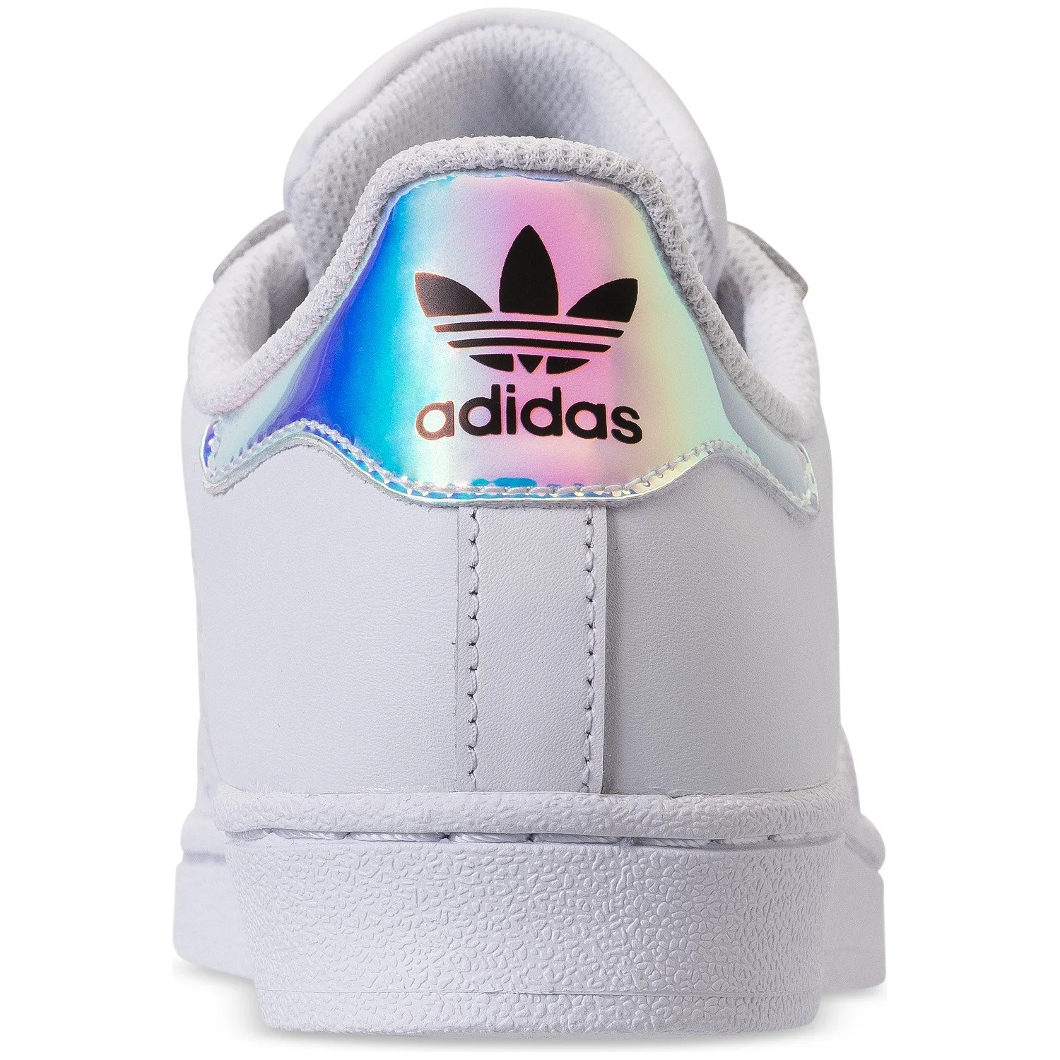 The Superstar J 'Iridescent' delivers a vibrant pop of color to the classic adidas silhouette, offered in kids’ sizing. The model’s signature details remain intact, including a white leather upper, rubber shell toe and gold foil ‘Superstar’ branding on the quarter panel. This shoe’s defining characteristic arrives via the Three-Stripes and heel tab, which are rendered with a unique iridescent finish incorporating a blend of blue and pink hues. A durable rubber cupsole sports a herringbone pattern on the outsole.