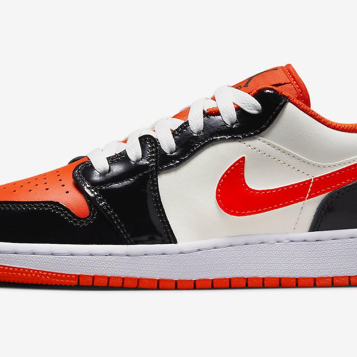 The Air Jordan 1 Low GS 'Halloween' is a special edition designed to celebrate the spooky season with a bold and eye-catching colorway. The sneaker features a vibrant mix of Team Orange, Black, Sail, and Iron Grey, creating a striking look that stands out. The upper is crafted from a combination of leather and patent leather, providing both durability and a premium feel. The classic Air Jordan 1 Low silhouette is retained, with a low-top profile and iconic design elements like the stitched-down Swoosh logo and the Jumpman logo on the tongue. The shoe also includes a cushioned midsole for comfort and a durable rubber outsole for traction.